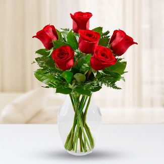 Nothing speaks of love so much as a bouquet of beautiful 6 long stem red roses. Arranged in a classic glass vase, this bouquet is a gift to her heart from yours.